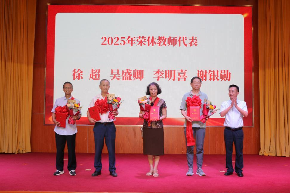 党委常委、副校长刘修海为2025年退休教师代表徐超、谢银勋等4人颁发荣休证书。